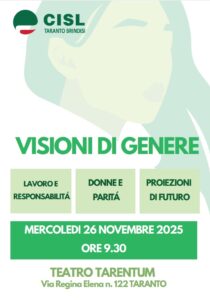 “Visioni di genere”: sarà questo il filo conduttore dell’evento pubblico organizzato, in occasione della Giornata internazionale per l’eliminazione della violenza contro le donne, dalla Cisl territoriale presso il Teatro Tarentum, in via Regina Elena, n. 122 a Taranto, per mercoledì 26 novembre p.v. con inizio alle ore 9:30.