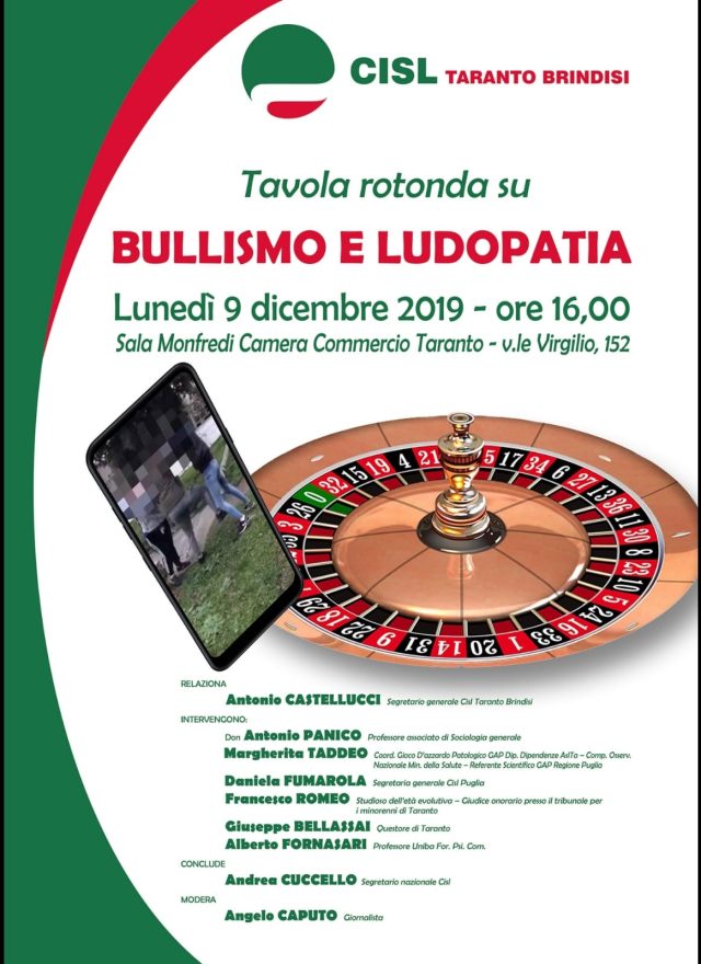 La UST ha programmato una Tavola rotonda su “Bullismo e Ludopatia” per lunedì 9 dicembre p.v. con inizio alle ore 16.00, presso la Sala Monfredi Camera di Commercio, viale Virgilio n. 152 a Taranto.