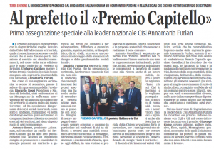 E facendo riferimento ai valori Cisl, uniti alla forte azione sindacale, politica, sociale che ha contraddistinto l’operato anche della segretaria generale Annamaria Furlan, su tutto il territorio nazionale, per cui è stato deciso di conferirle un Premio Capitello speciale, Castellucci ha ricordato che “in questi anni, lei ha avuto la forza e la pazienza di cambiare concretamente la Cisl, facendo della responsabilità, della trasparenza, dell’ascolto, della testimonianza, del servizio e dell’impegno quotidiano, gli elementi necessari per svolgere al meglio e serenamente il ruolo di sindacalista, con spirito confederale ed un comune sentire a tutti i livelli, seppur con ruoli e responsabilità diverse, rafforzato dalla consapevolezza di poter trasferire lo stesso spirito alle persone che assistiamo e tuteliamo ogni giorno.”